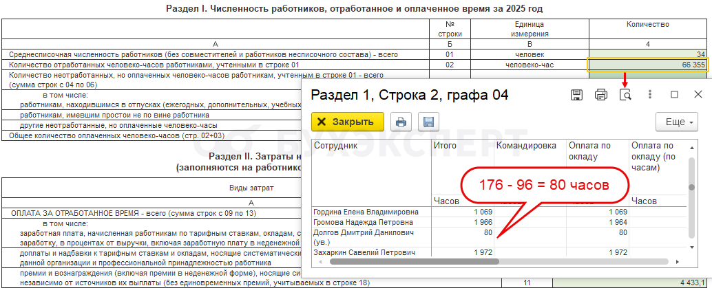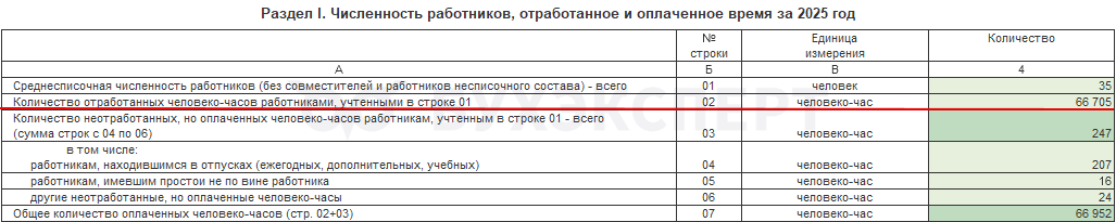 В строке 02 указываем количество фактически отработанных человеко-часов за 2025 год сотрудниками, которых включили в расчет среднесписочной численности в строке 01.