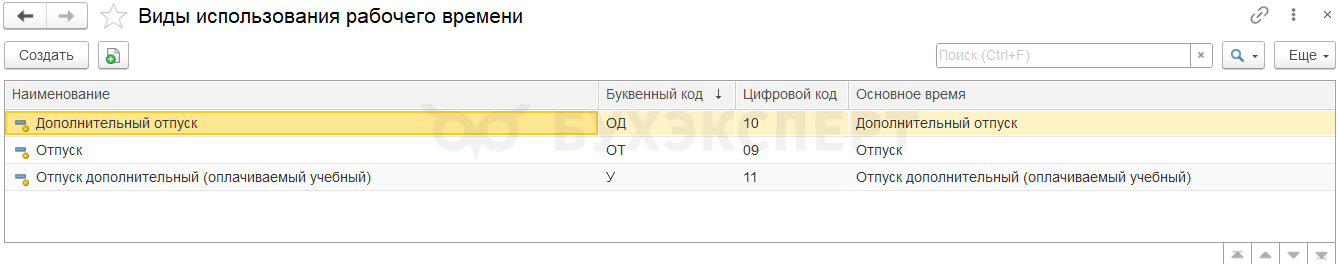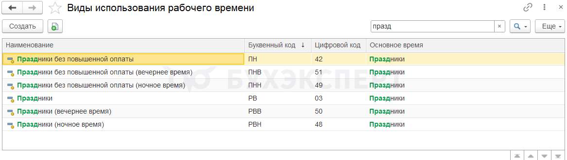 • Время работы в праздничные (нерабочие) и выходные дни сверх графика. В программе для учета таких часов в зависимости от настроек может быть до 6 типовых видов времени