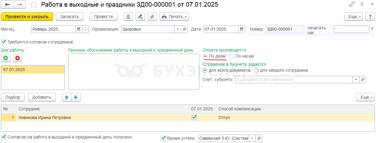 Если в документе Работа в выходные и праздники (Зарплата – Учет времени – Работа в выходные и праздники) включена оплата по дням