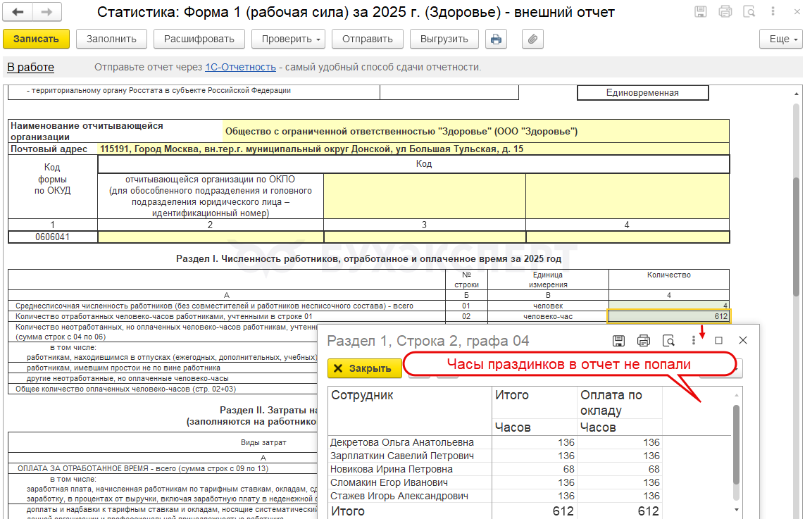 Если нужно проверить среднесписочную численность по группе подразделений, или исключить несколько подразделений при проверке численности организации – можно использовать донастроенный отчет от Бухэксперт Проверка средней численности в П-4.