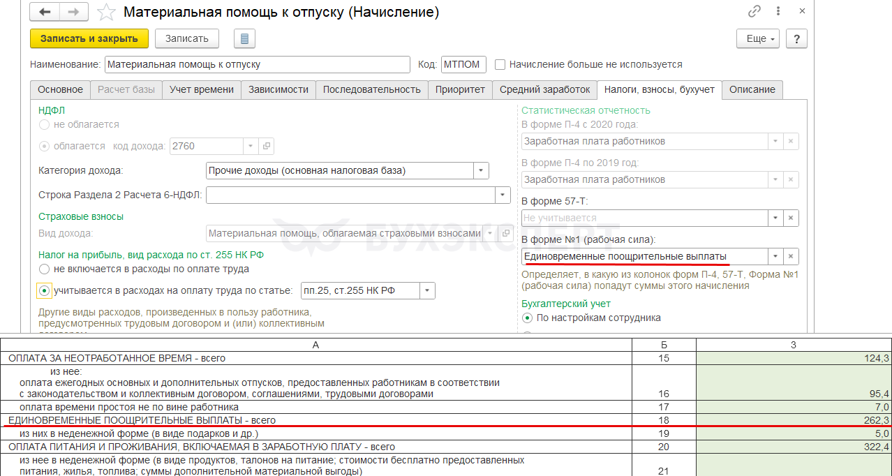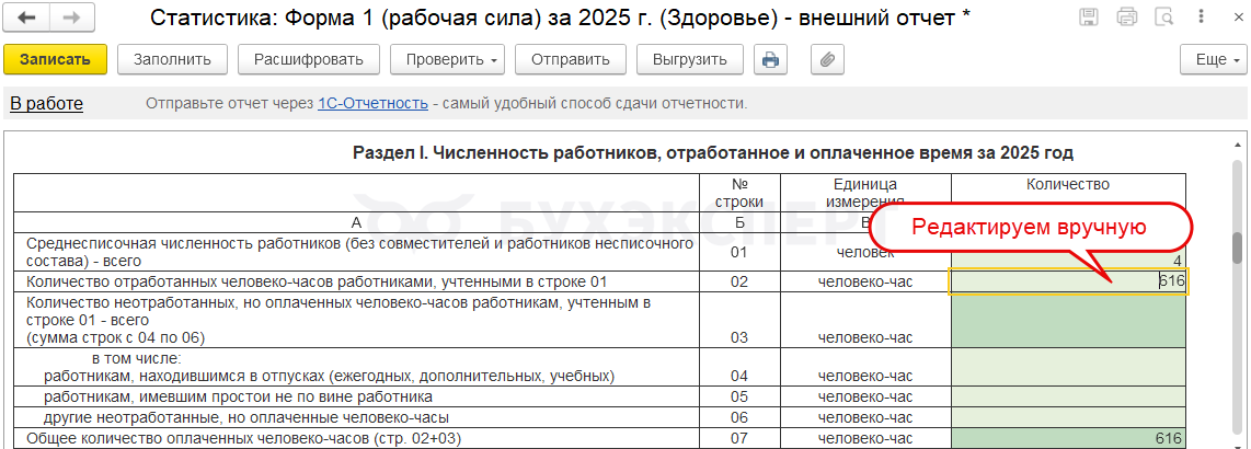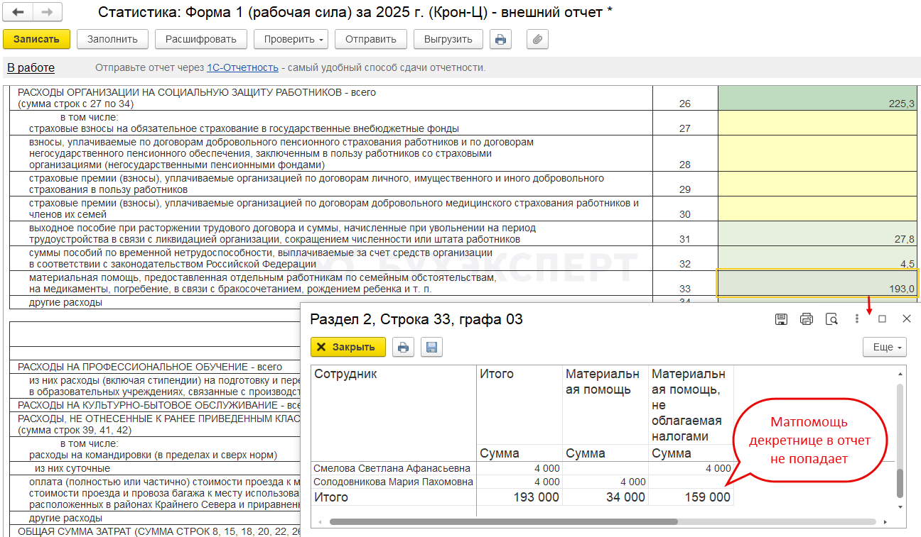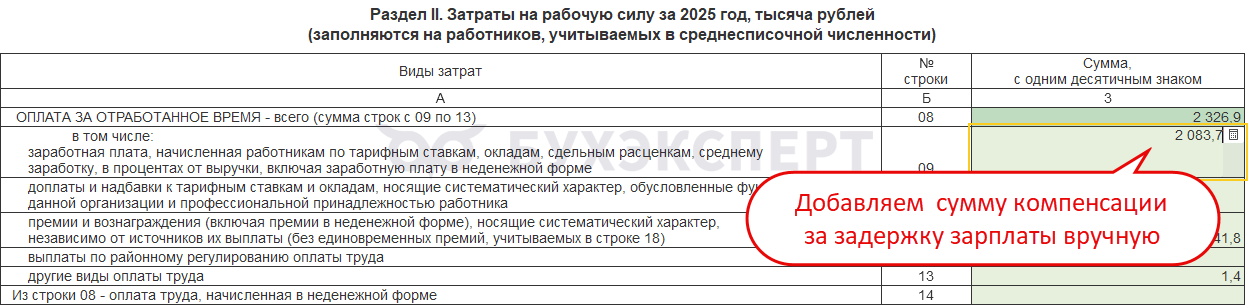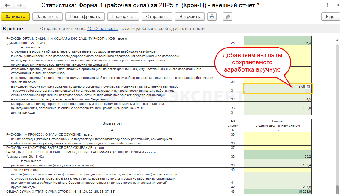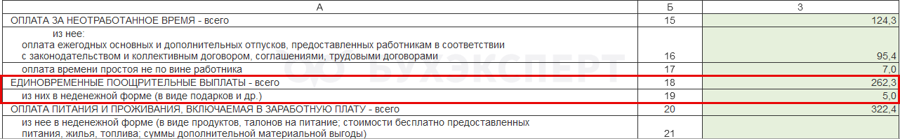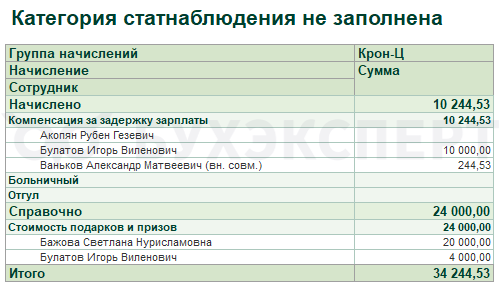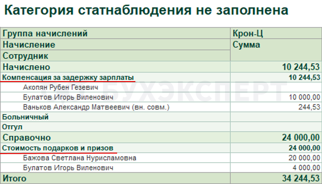 Например, для компенсации за задержку зарплаты, призов и подарков возможности указать категорию в программе нет. Поэтому в отчет для статистики автоматически они не попадают. Если эти выплаты нужно показать в Форме 1 – добавляем суммы в статформу вручную.