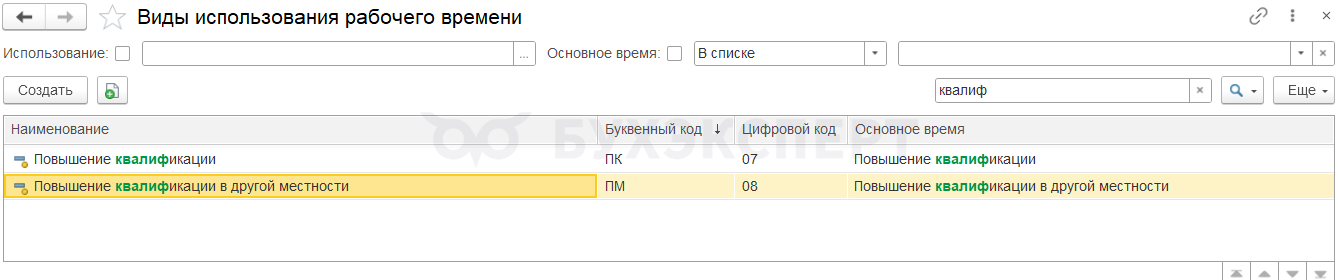 • повышения квалификации или профподготовки – виды времени Повышение квалификации и Повышение квалификации в другой местности