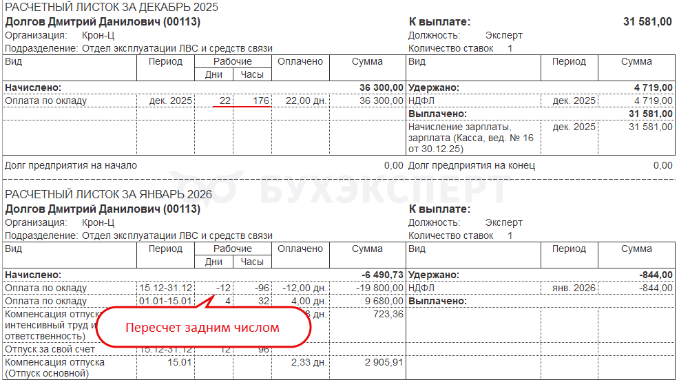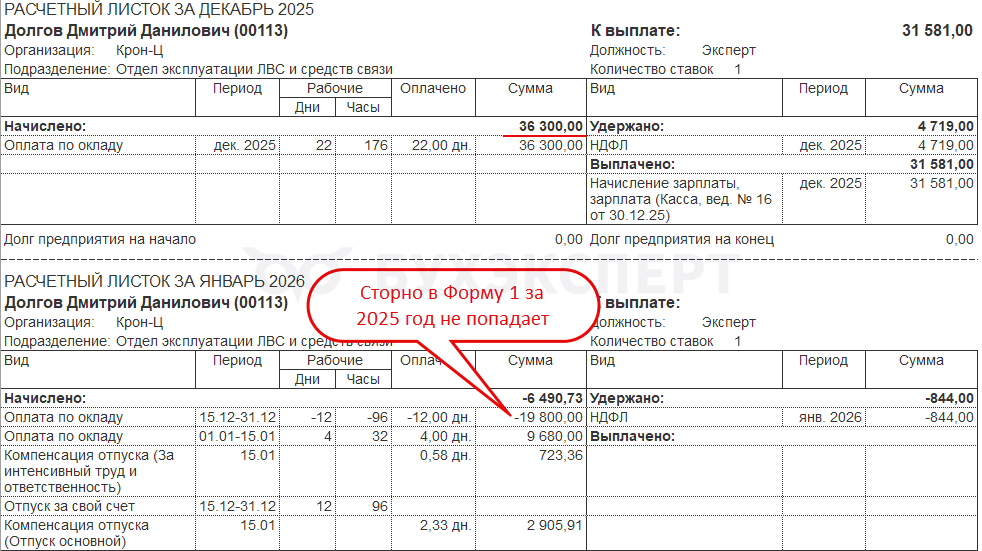 Например, в декабре 2025 был начислен полный оклад, а в январе 2026 по сотруднику ввели отпуск без сохранения задним числом и отсторнировали часть оклада. Поскольку перерасчет зарегистрирован в 2026 году - сторно оклада в Форму 1 за 2025 год не включается.