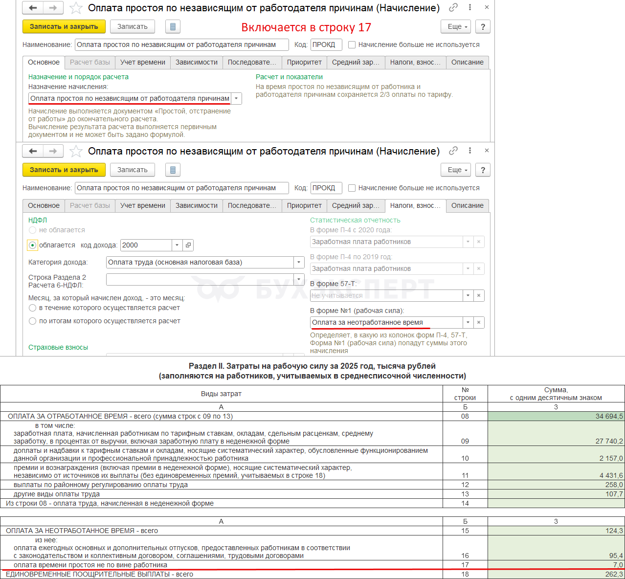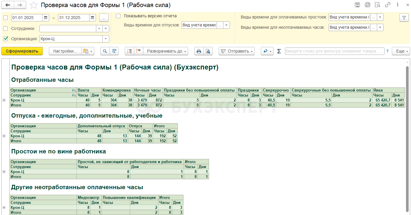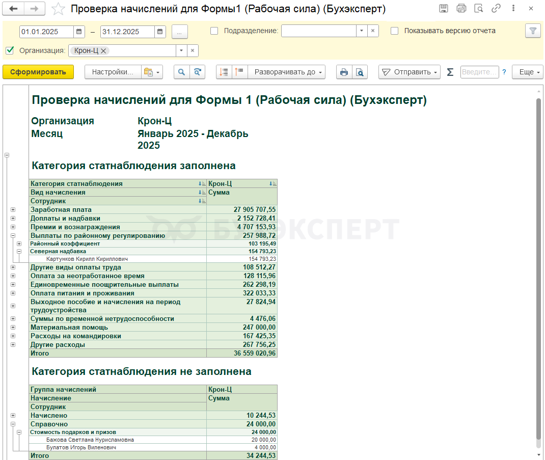 Для контроля сумм по категориям начислений мы предлагаем донастроенный отчет от Бухэксперт Проверка начислений для Формы 1 (Рабочая сила). Донастроенный отчет предназначен для загрузки в Полный свод начислений, удержаний и выплат. В отчете выводятся суммы по категориям статнаблдения согласно настройкам начислений. Это позволяет сверить суммы по категориям со строками отчета.