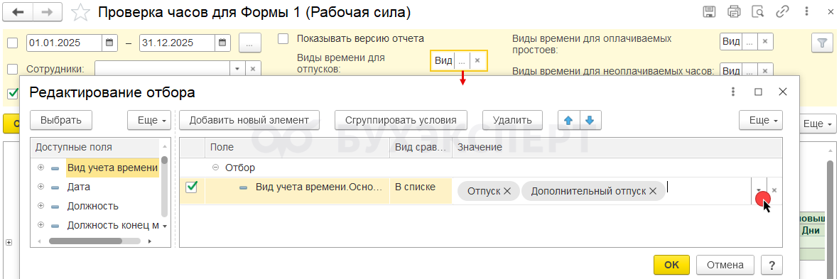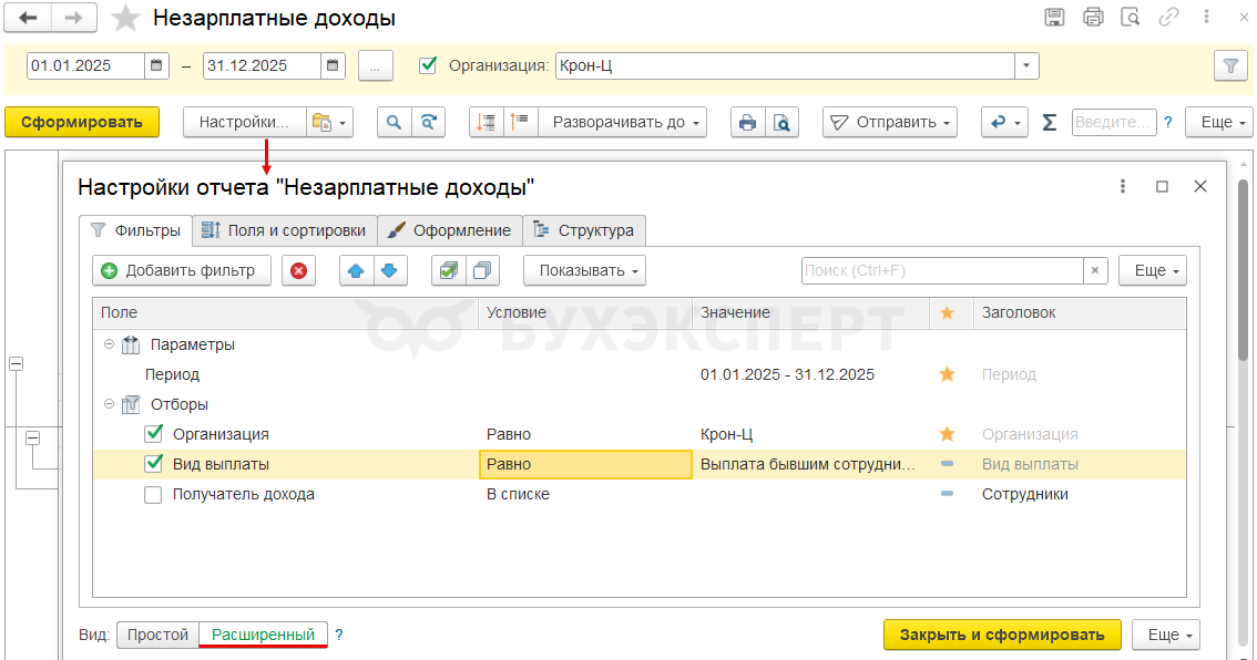 Чтобы отобрать только Выплату бывшим сотрудникам – в настройках отчета включаем отбор по виду выплаты