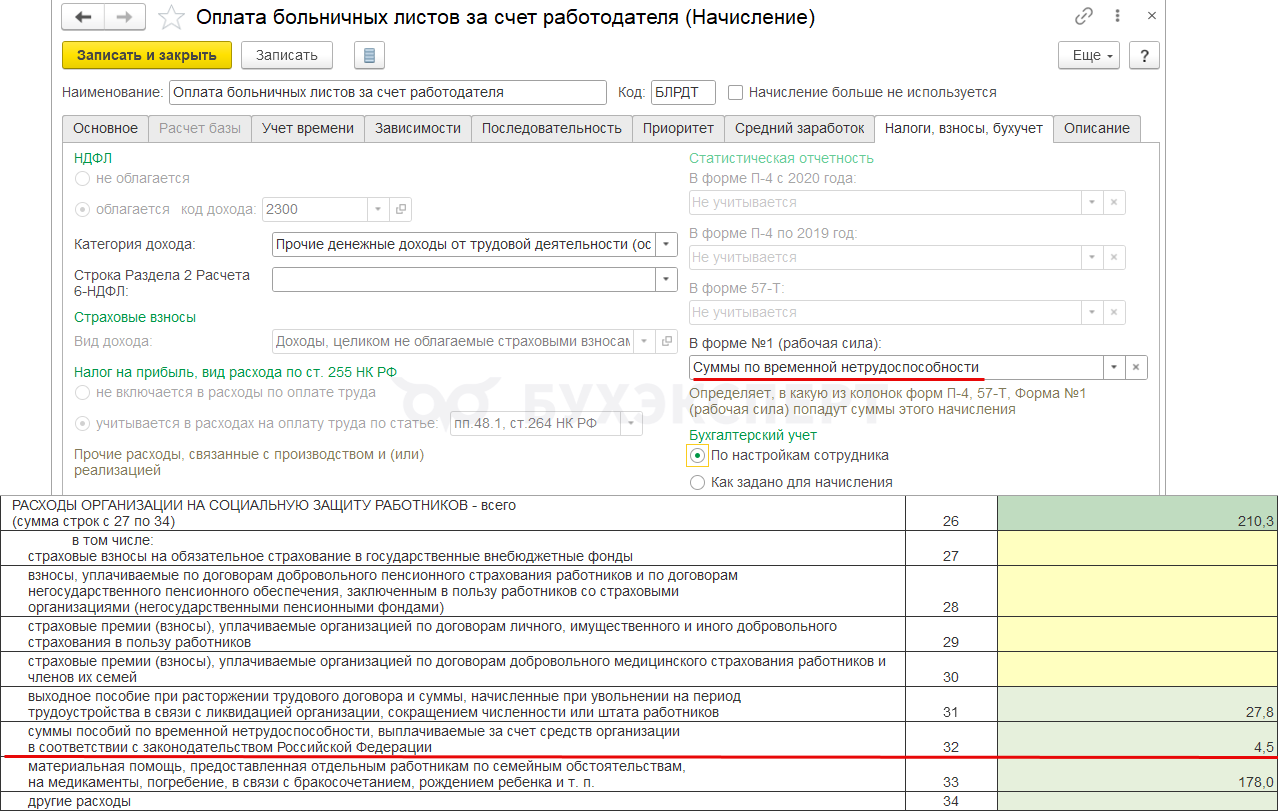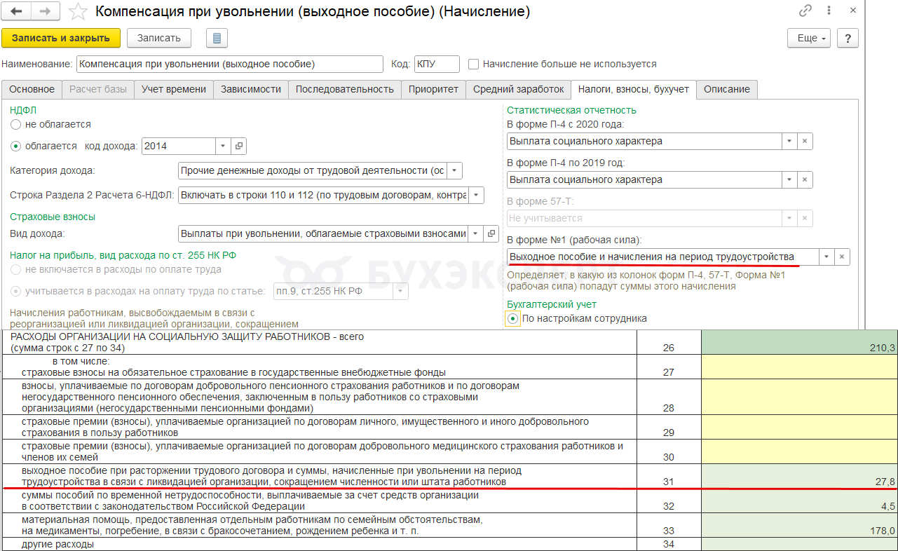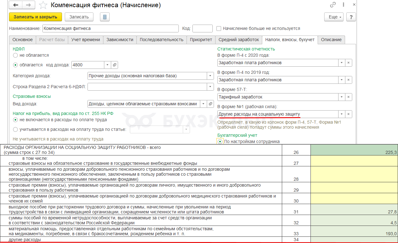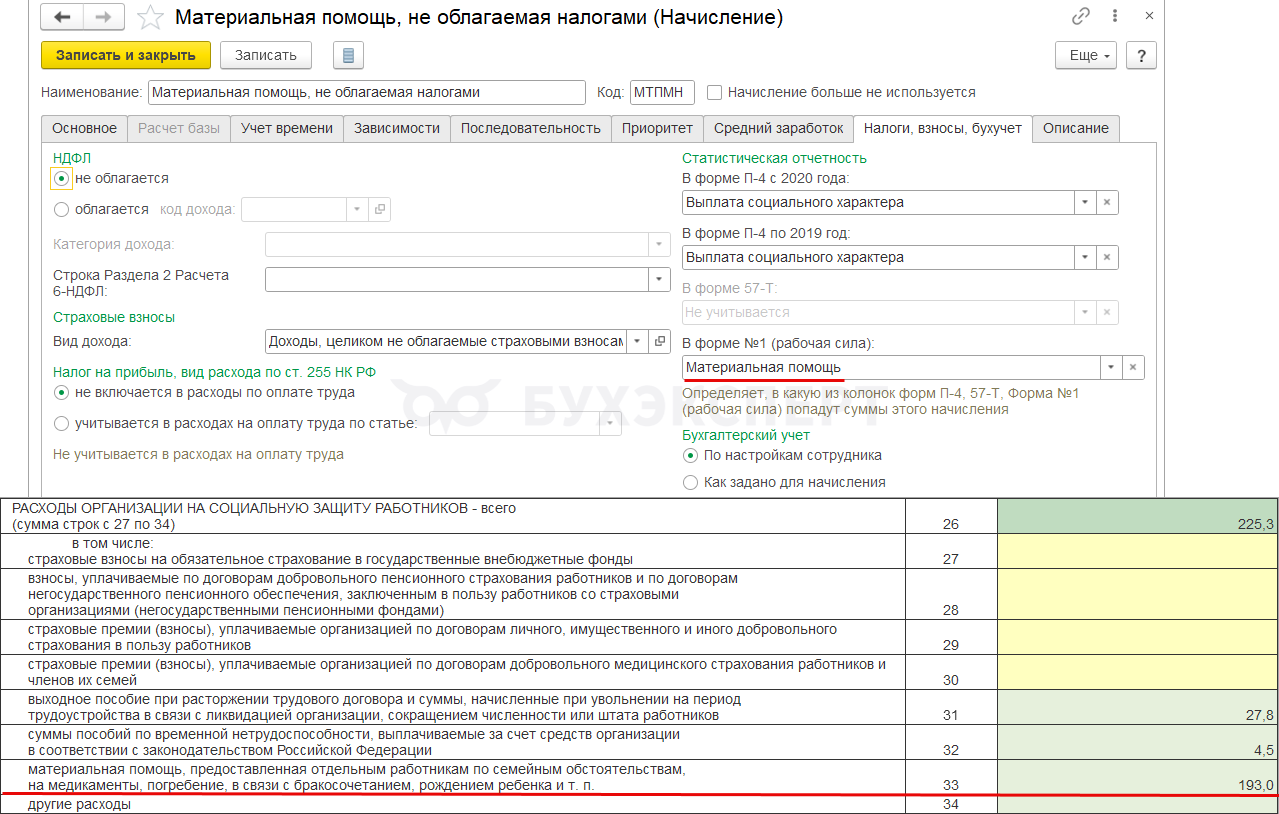Чтобы начисление попало в строку 34 отчета, в настройках нужно указать категорию статистического наблюдения Другие расходы на социальную защиту