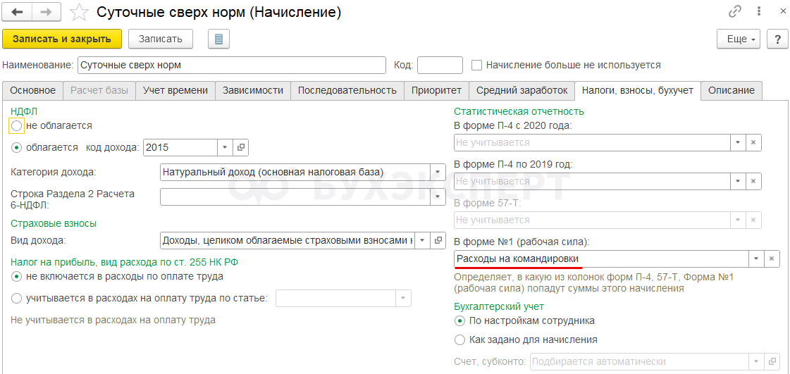 Несмотря на то, что суточные в пределах норм не облагаются НДФЛ и взносами, в ЗУП 3.1 их нужно учитывать не только для отражения в Форме 1, но и чтобы показать в Расчете по страховым взносам - Суточные в пределах норм