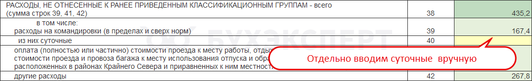 При этому сумму суточных также требуется отдельно указать вручную в строке 40.