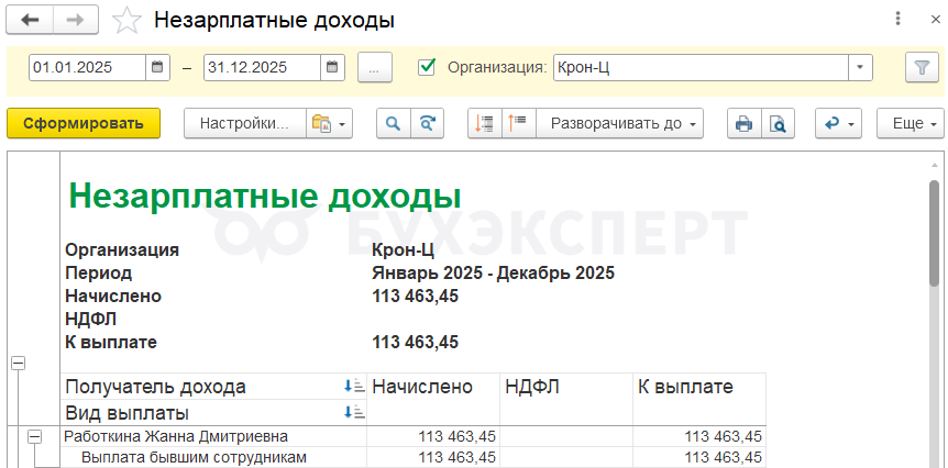 Поэтому если в 2025 году были такие выплаты - суммы для проверки и ручного внесения в Форму 1 можно взять из типового отчета Незарплатные доходы (Выплаты – Отчеты по выплатам).