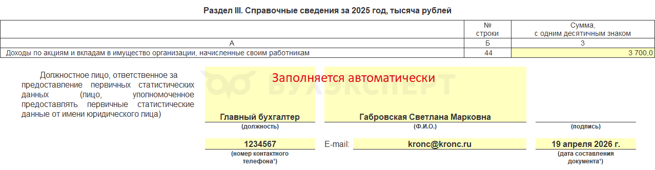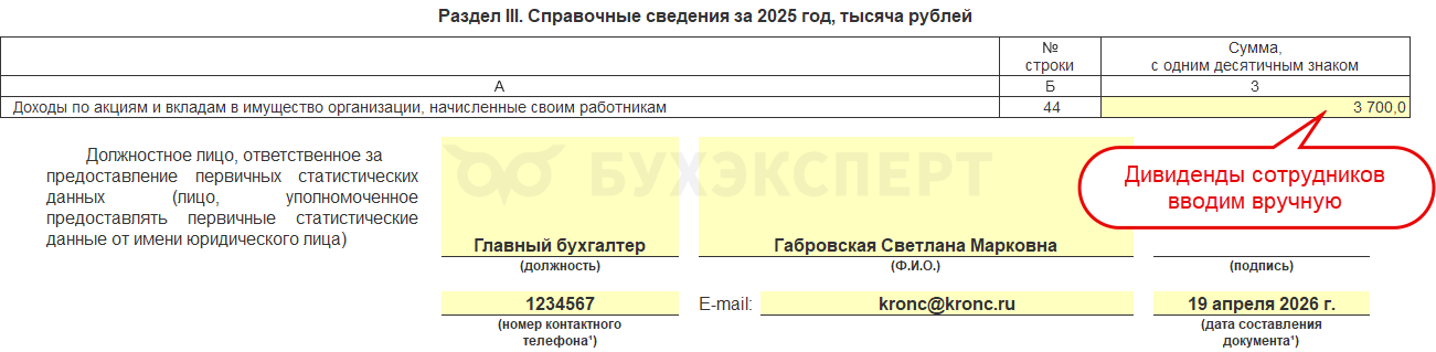 В разделе III в строку 44 вручную вводим сумму дивидендов, начисленных сотрудникам организации.
