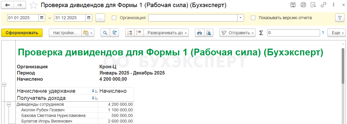 Проверить суммы дивидендов для Раздела III можно в отчете Незарплатные доходы (Выплаты – Отчеты по выплатам). Чтобы среди всех незарплатных доходов отобрать начисления только по дивидендам сотрудников, мы предлагаем донастроенный отчет от Бухэксперт Проверка Дивидендов для Формы 1. Настройки предназначены для загрузки в типовой отчет Незарплатные доходы.
