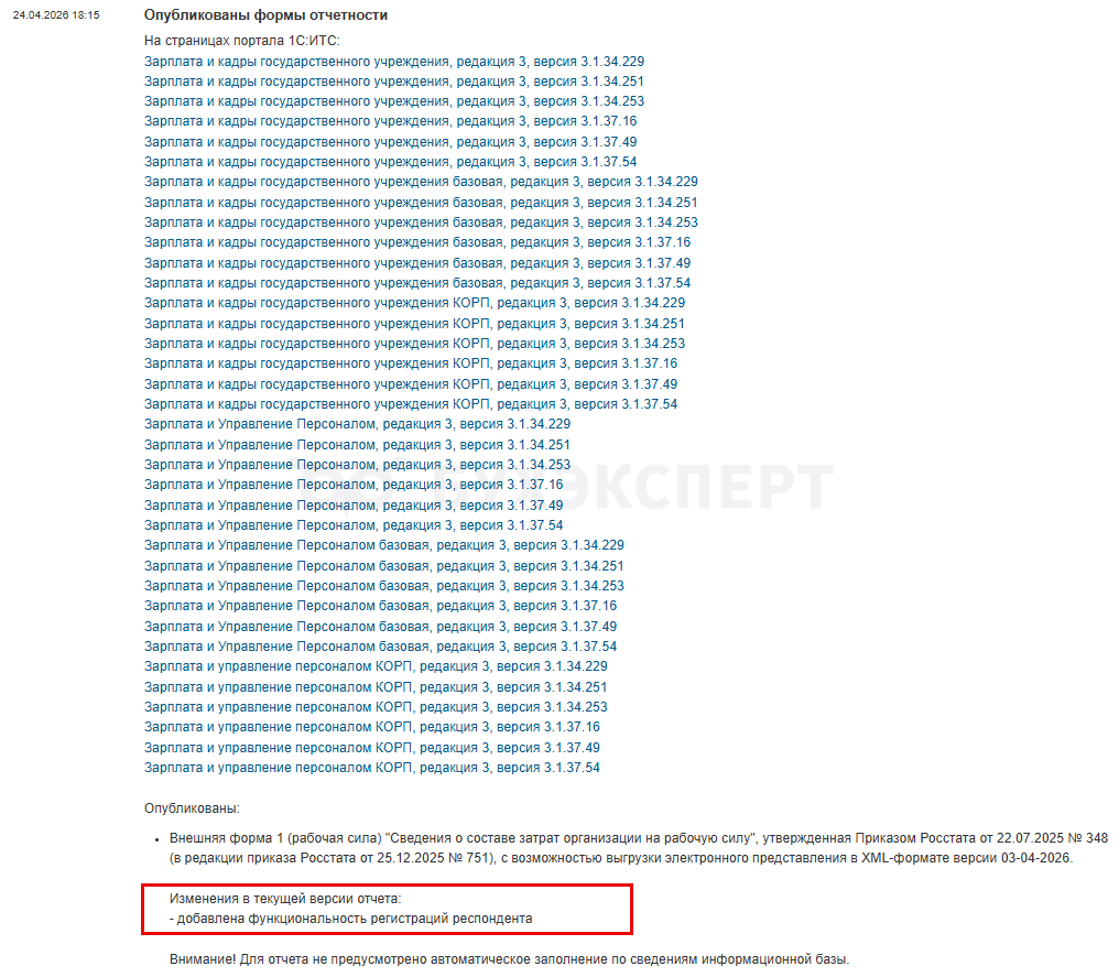 В видео говорится о том, что выгрузка и отправка Формы 1 (рабочая сила) возможна только начиная с релизов ЗУП 3.1.34.251 / 3.1.37.49. Однако по состоянию на 25.04.2026 фирма 1С выпустила внешний отчет, который позволяет выгрузить и отправить форму в более ранних релизах — начиная с ЗУП 3.1.34.229 / 3.1.37.16.