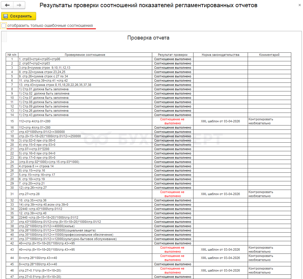 Чтобы вывести полный список проверок, снимаем флажок Отобразить только ошибочные соотношения.
