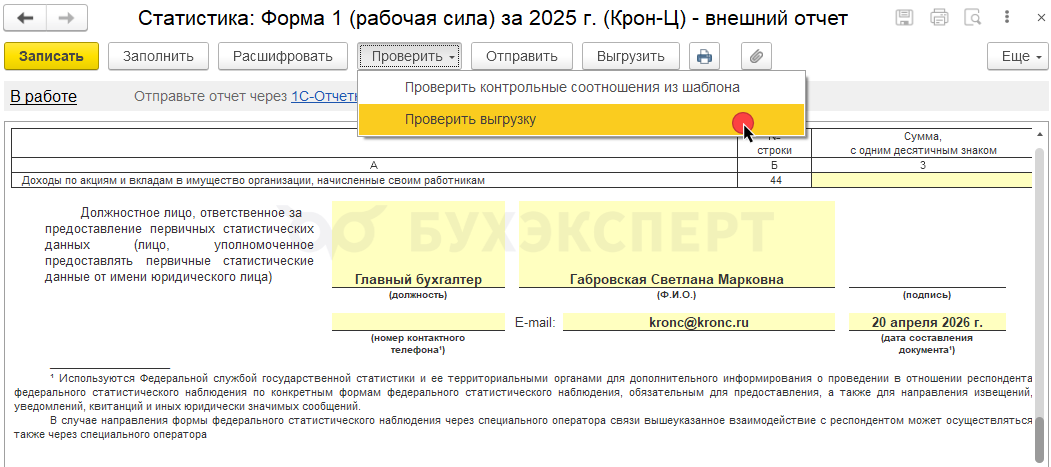 Если отчет выгружаем в файл, тогда по команде Проверить - Проверить выгрузку проверяем соответствие файла выгрузки требуемому формату и полноту заполнения обязательных реквизитов.
