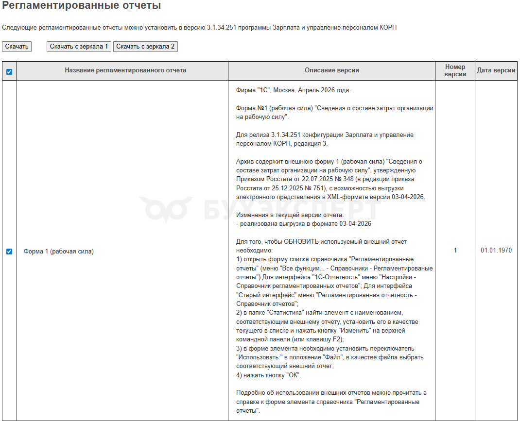 24 апреля 2026 года Фирма 1С выпустила новую версию внешнего отчета для Формы 1 (рабочая сила). В ней появилась возможность сформировать отчет по Регистрации в Росстате - Формирование статистических отчетов по территориальному признаку (ЗУП 3.1.29.21)