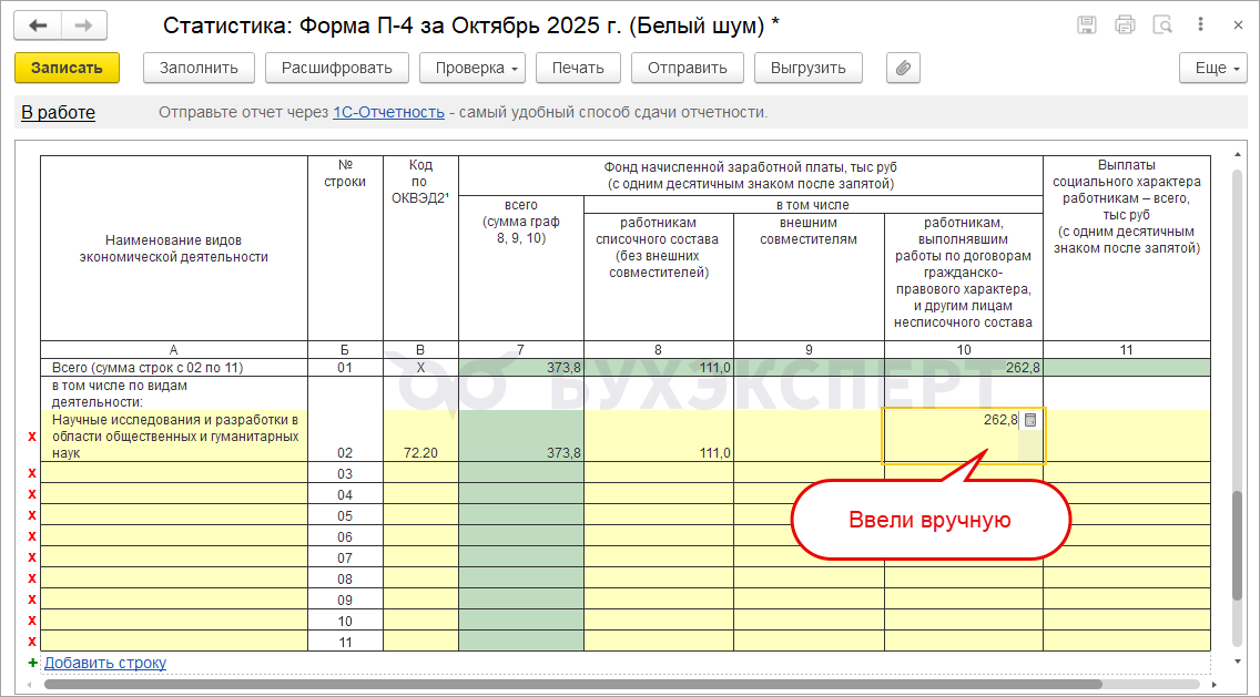 Если следовать вышеприведенным указаниям Росстата – начисления сотрудницы нужно ввести в графу 10 вручную.