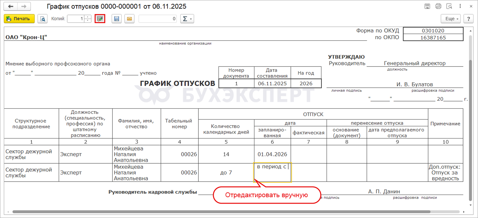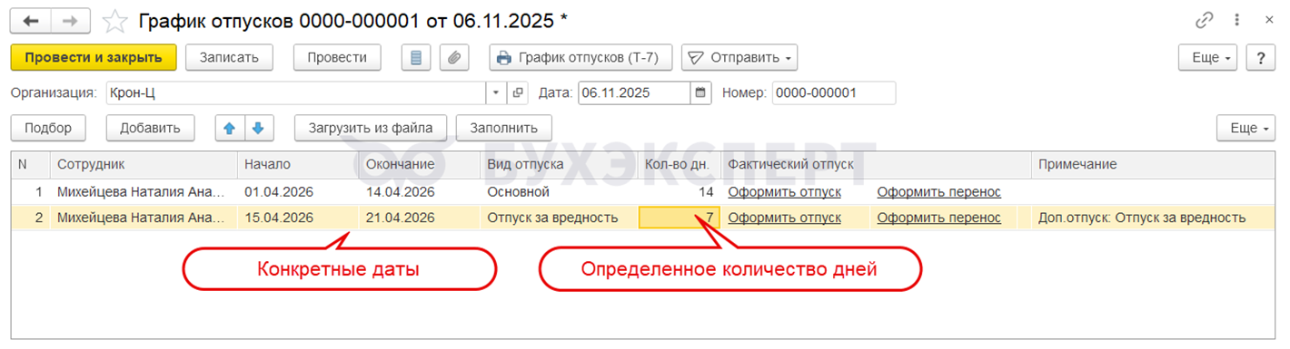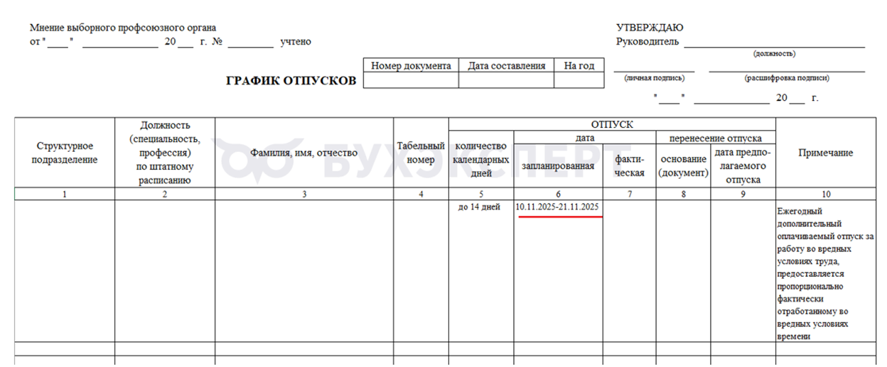 Обратите внимание, если в графике отпусков «вреднику» установить точное количество дней допотпуска, а потом пересчитать их по факту, это может привести к спорам с работником. Свежий пример из судебной практики — Определение Седьмого КСОЮ от 23.12.2024 N 88-22417/2024.