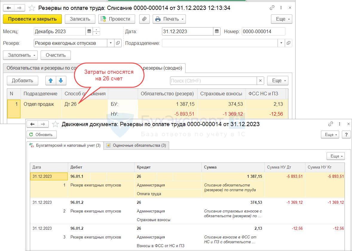 В типовом механизме проводки по документу Резервы по оплате труда с типом Списание формируются следующим образом: