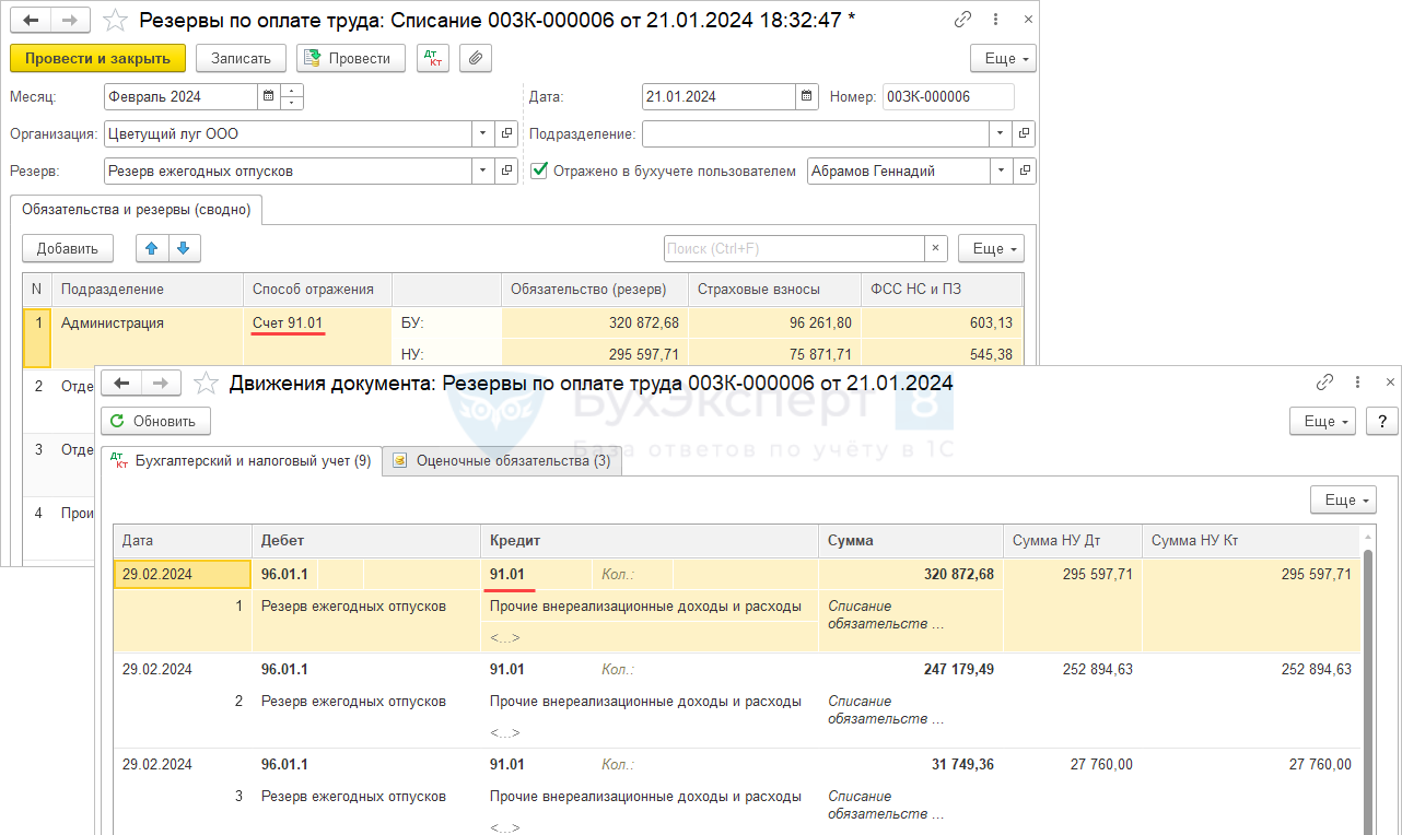 - Для списания положительных остатков резерва можно настроить свой способ отражения на счет 91.01 и указать его вручную в документе Резервы по оплате труда. Тогда при проведении документа в БП 3.0 сформируются проводки Дт 96 Кт 91.01