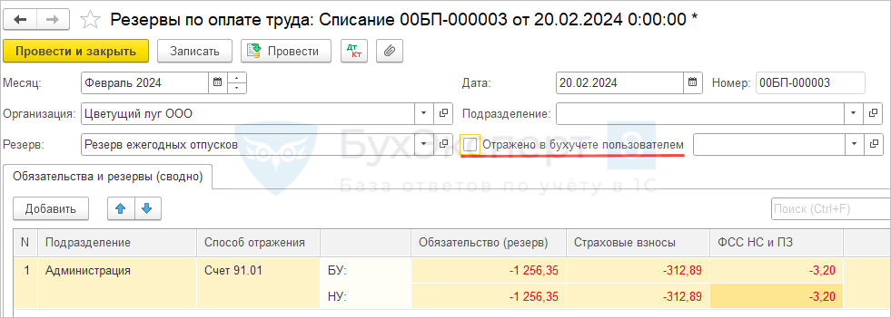 - Для списания отрицательных остатков резерва в 1С:Бухгалтерии сформировать проводки вручную, документом Операция, введенная вручную. А документ Резервы по оплате труда с типом Списание, напротив, не должен формировать проводки. Поэтому для него не нужно устанавливать флажок Отражено в бухучете пользователем.
