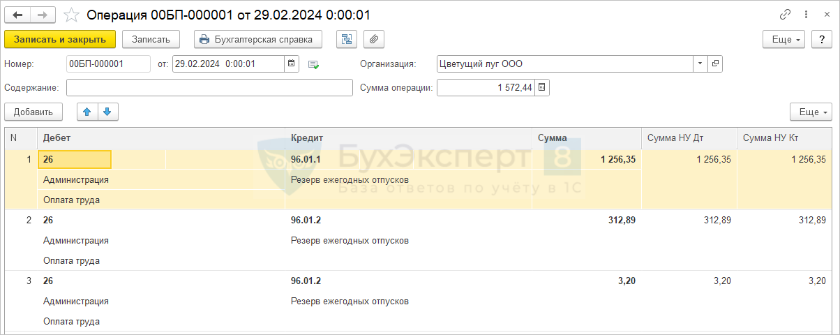 При закрытии месяца 1С:Бухгалтерия пытается исправить это «кривые» проводки. Регламентная операция Корректировка списания сторнирует проводки, сформированные документом Резервы по оплате труда с типом Списание. В результате хвосты по резервам остаются зависшими в БП 3.0.