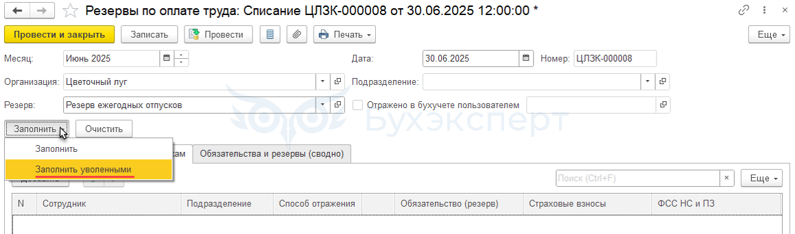 Если сотрудник уволен задним числом, то автоматически списание остатка резерва по нему не произойдет. Обязательно вводить документ Списание. В документе выбрать вариант Заполнить уволенными.