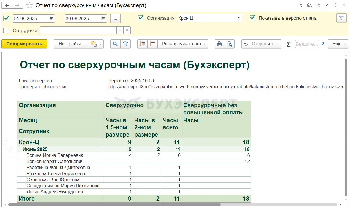 Предлагаем настройки отчета по сверхурочным часам. Часы работы за повышенную оплату разбиты на оплачиваемые в полуторном и в двойном размере.