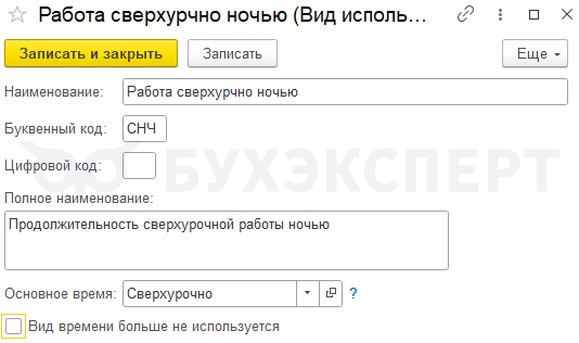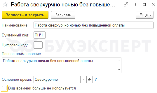 Шаг 1. Создадим новый вид времени для учета часов сверхурочной работы ночью за отгул – Работа сверхурочно ночью без повышенной оплаты