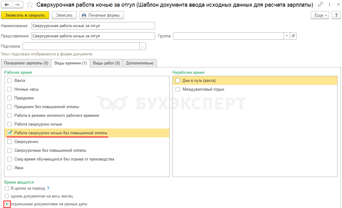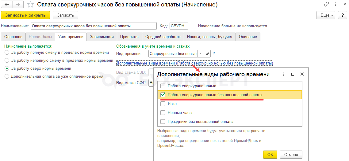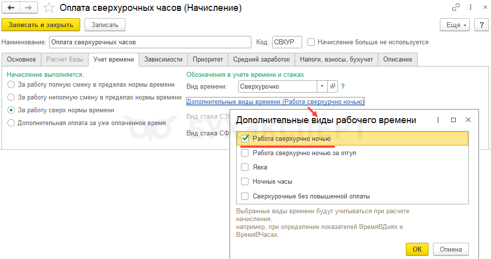 - В настройках оплаты сверхурочной работы и доплаты за ночные часы добавить новые виды времени