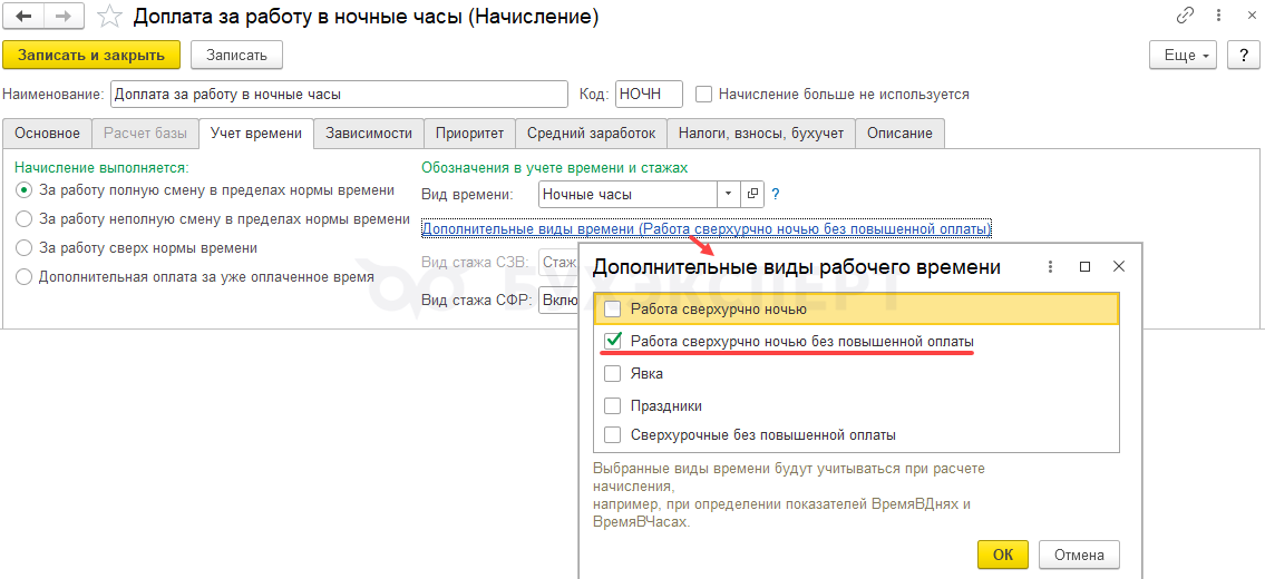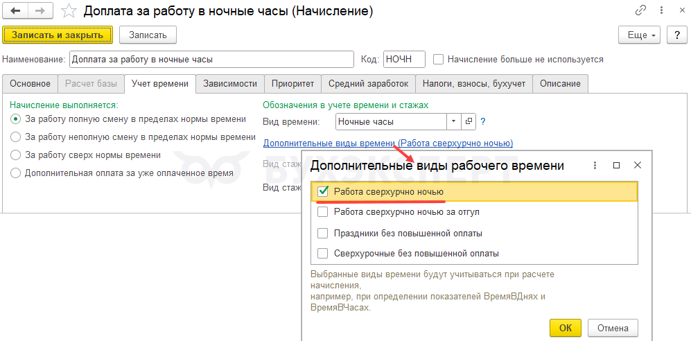 Чтобы за ночные часы сверхурочной работы рассчитывалась доплата за ночное время, в настройках начисления Доплата за работу в ночные часы также добавим новый вид времени Работа сверхурочно ночью.
