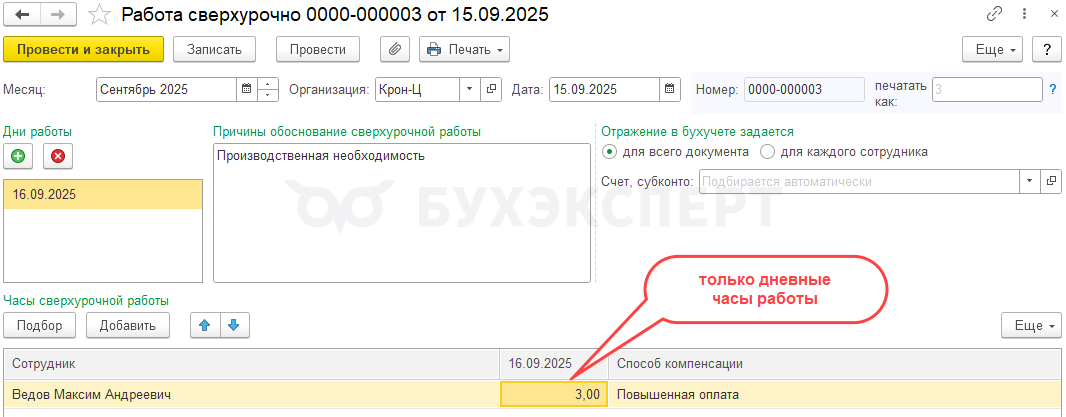 Документ Работа сверхурочно вводим только, чтобы отразить дневные часы сверхурочной работы. Количество часов укажем 3 (только дневные часы сверхурочной работы).