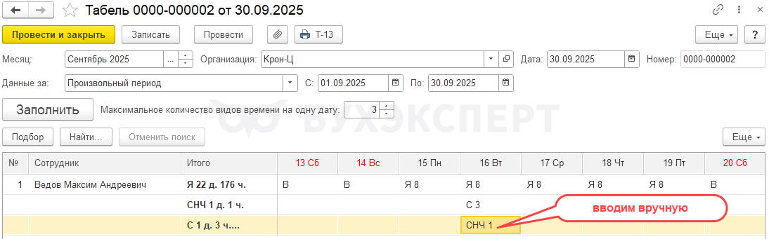 Шаг 3. Сверхурочную работу в ночное время зарегистрируем: