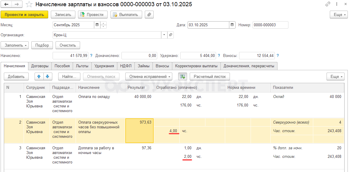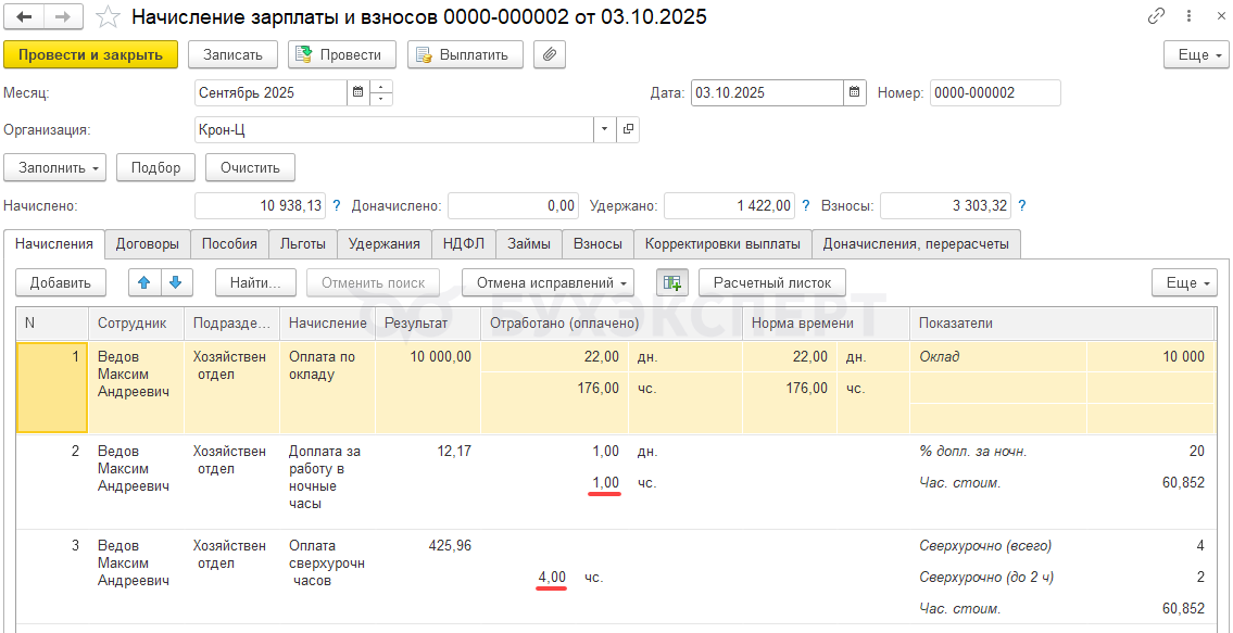 Если ВНИМАТЕЛЬНО внести все часы одной и то же датой, то программа видит все 4 часа в этот день, и 1 час дневной в документе «Работа сверхурочно» и 3 часа ночные через «Данные для расчета зп». И верно их оплачивает в итоге, — 1 час дневной и 1 час ночной с к=1,5 (в пределах 2-х часов), далее 2 часа ночных с к=2.