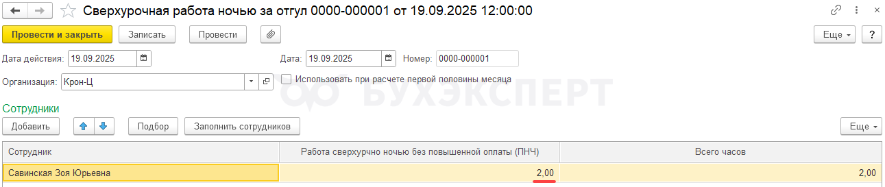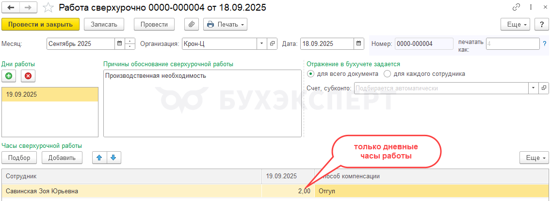 - Дневные часы работы – документом Работа сверхурочно. Количество часов укажем 2 (только дневные часы сверхурочной работы)