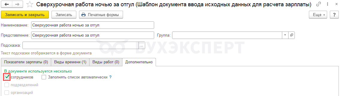 На вкладке Дополнительно установим флажок В документе используются несколько сотрудников – тогда в одном документе можно будет вводить данные о времени для нескольких сотрудников.