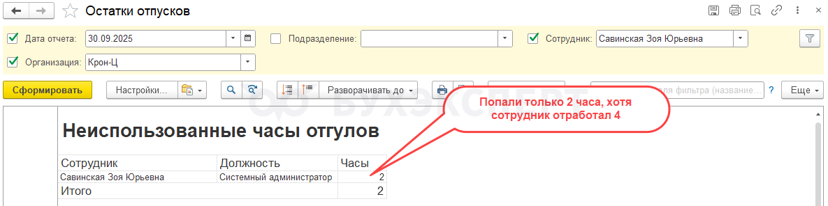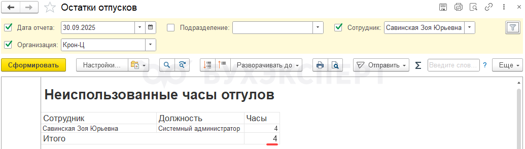 После этого в отчете Остатки отпусков будут учтены все 4 часа отгула – которые были заработаны 19 сентября в дневное, и в ночное время.