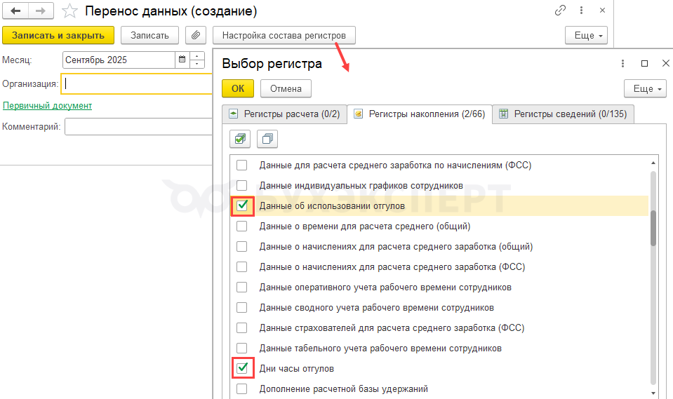 Чтобы увеличить остаток отгулов сотрудника еще на 2 ночных часа работы сверхурочно, используем документ Перенос данных (Администрирование – Переносы данных). По кнопке Настройка состава регистров выберем регистры, в которые будем вносить записи: