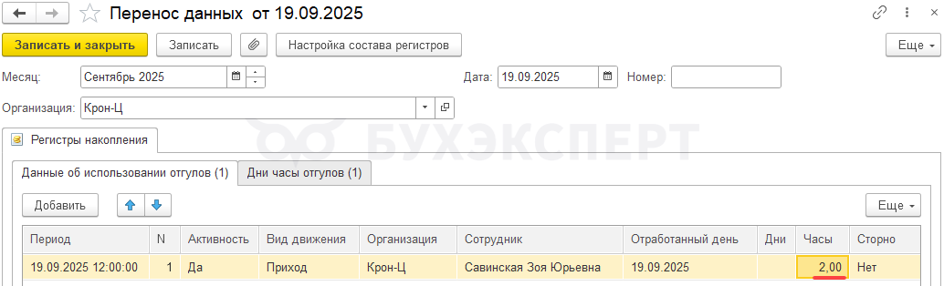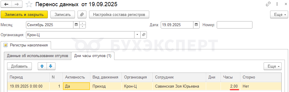 Шаг 5. Т. к. Савинская З. Ю. работала сверхурочно за отгул, остаток его отгулов нужно увеличить на 4 часа. Документ Работа сверхурочно увеличивает остаток отгулов сотрудника. Но этот документ мы вводили только на дневные часы, поэтому остаток отгулов сотрудника увеличился только на 2 часа вместо 4.
