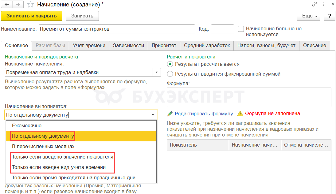 - Или отказаться от применения планового начисления и создать новый вид начисления для такой оплаты – настроить его, как разовое или выстреливающее начисление. Тогда, оно будет включаться в расчет показателя Стоимость дня(часа) с учетом разовых начислений в фактически начисленном размере – ФОТ уже не понадобится. Начисление будет разовым, если для него указан способ выполнения По отдельному документу, и выстреливающим, если способ выполнения выбран Только если введено значение показателя или Только если введен вид учета времени. Подробно о способе выполнения начислений – в статье Способ выполнения начисления