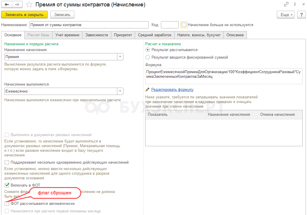 - В настройке начисления сбросим флаг ФОТ рассчитывается автоматически