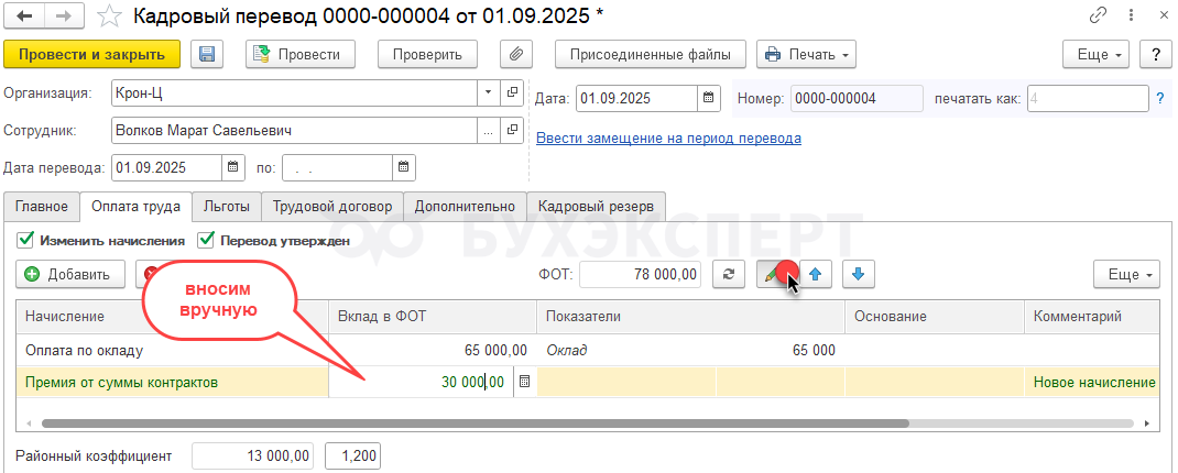 - Или указать ФОТ начисления вручную в документе, которые назначаем такое плановое начисление