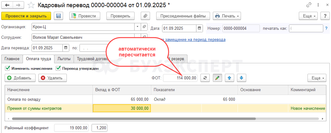 После того, как укажем размер ФОТ вручную, общий ФОТ по сотруднику автоматически пересчитается в документе. После этого он будет учитываться при расчете стоимости часа.