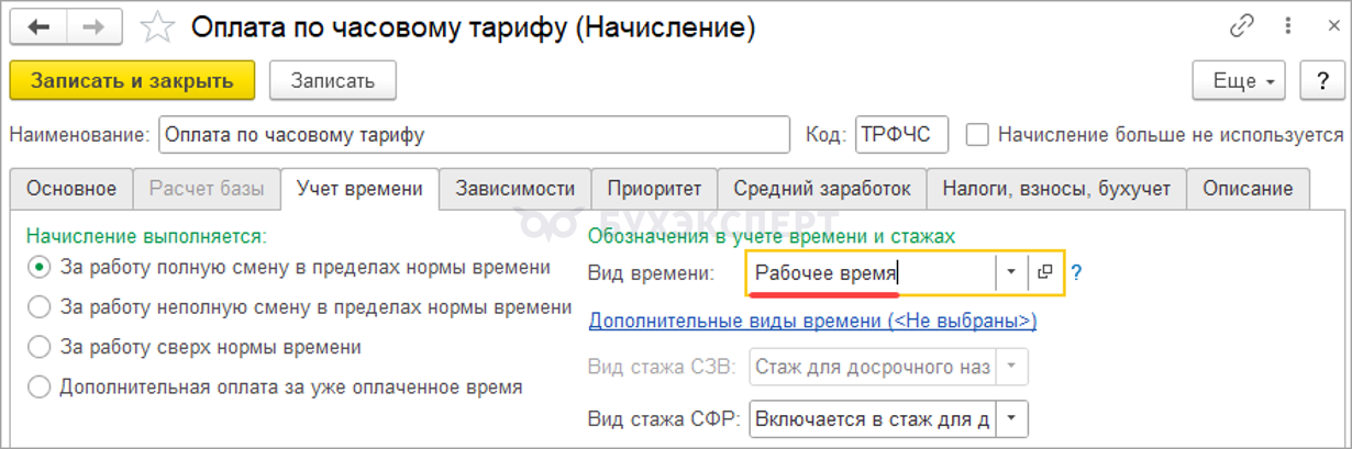 - на вкладке Учет времени должен быть указан вид времени Рабочее время или Вахта