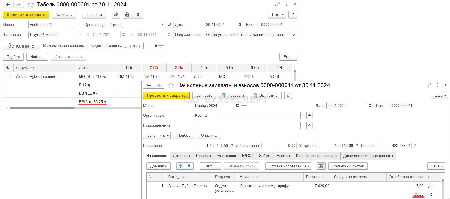 Результаты наших вычислений совпадают с расчетом в программе. Настройка начислений за отработанное время выполнена верно.