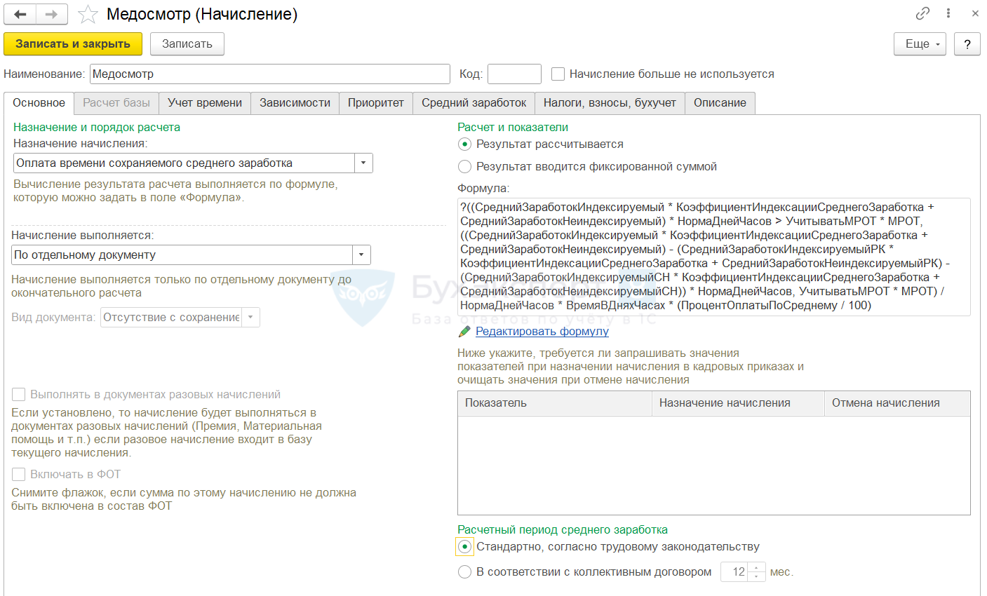 Формула начисления будет заполнена автоматически с порядком расчета – по среднему заработку.