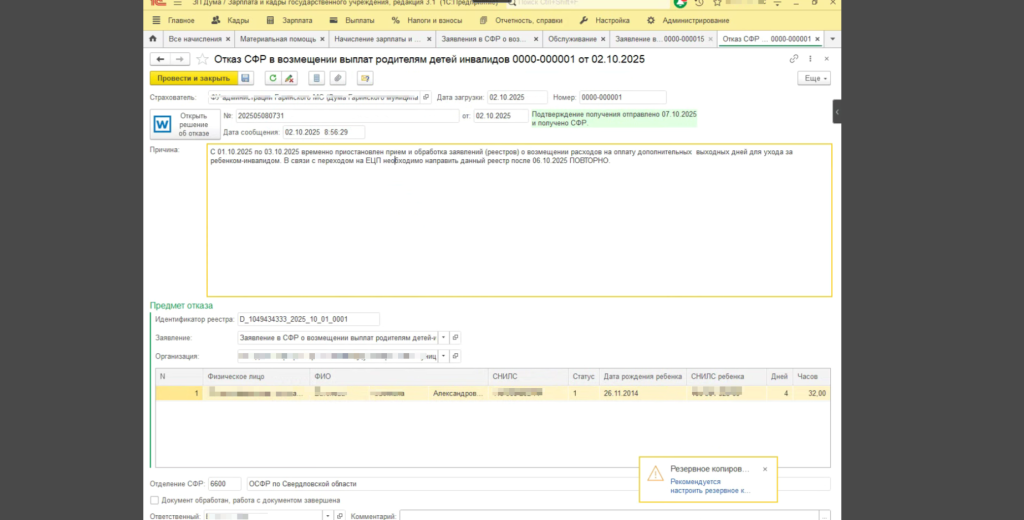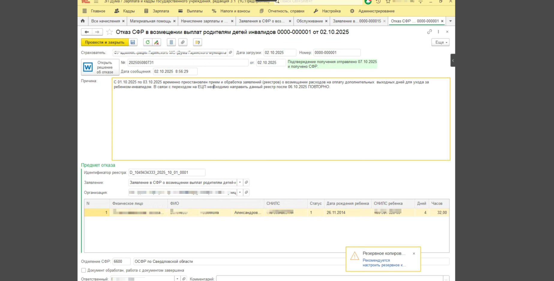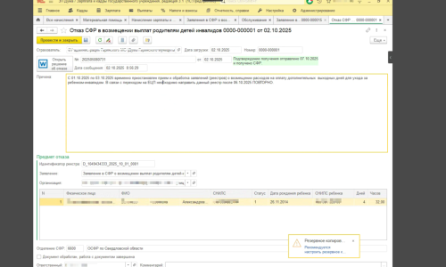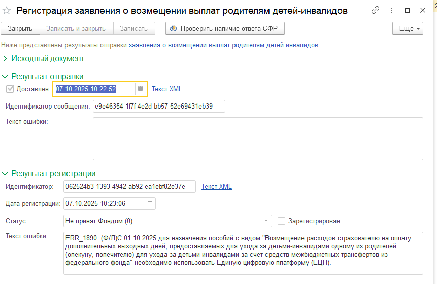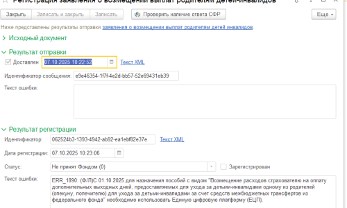 Добрый день! Сегодня 07.10.25 снова отправили Заявление СФР о возмещении выплат родителям детей-инвалидов. И снова эта же ошибка вышла