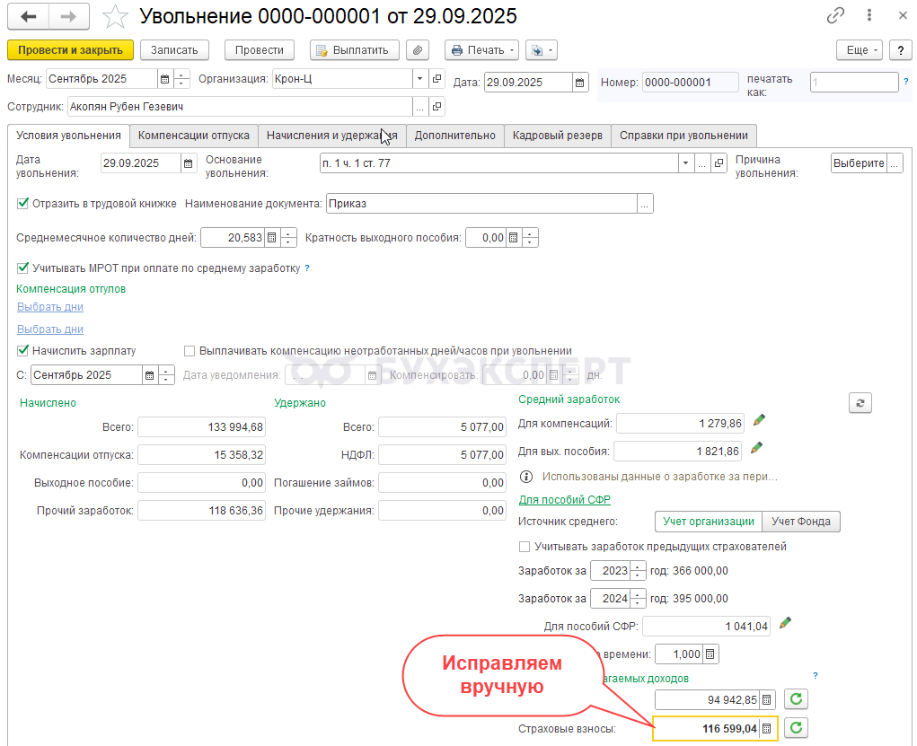 Важно рассчитать компенсацию именно в документе Увольнение – в этом случае программа сможет рассчитать НДФЛ и взносы с компенсации по правилам 2025 года.