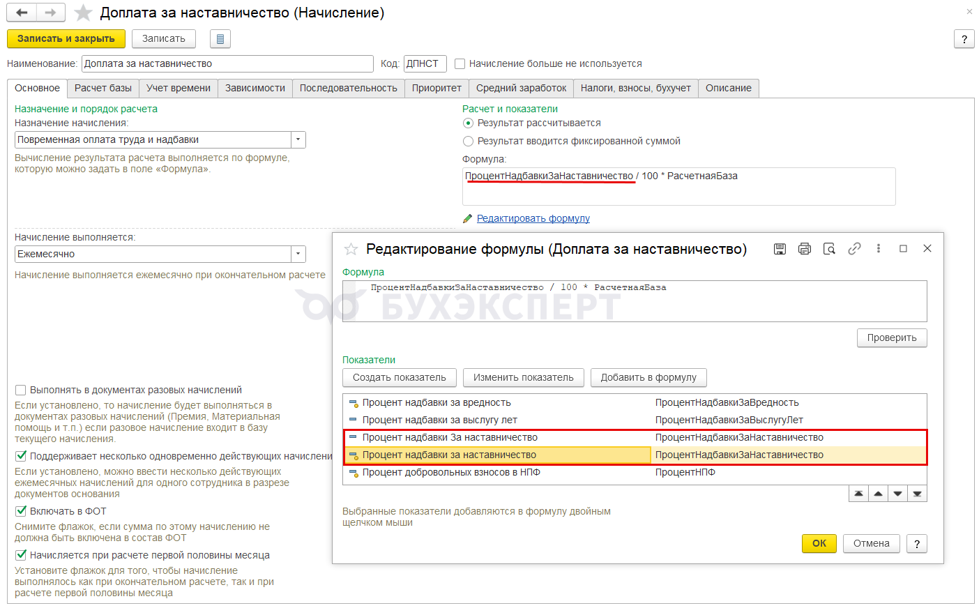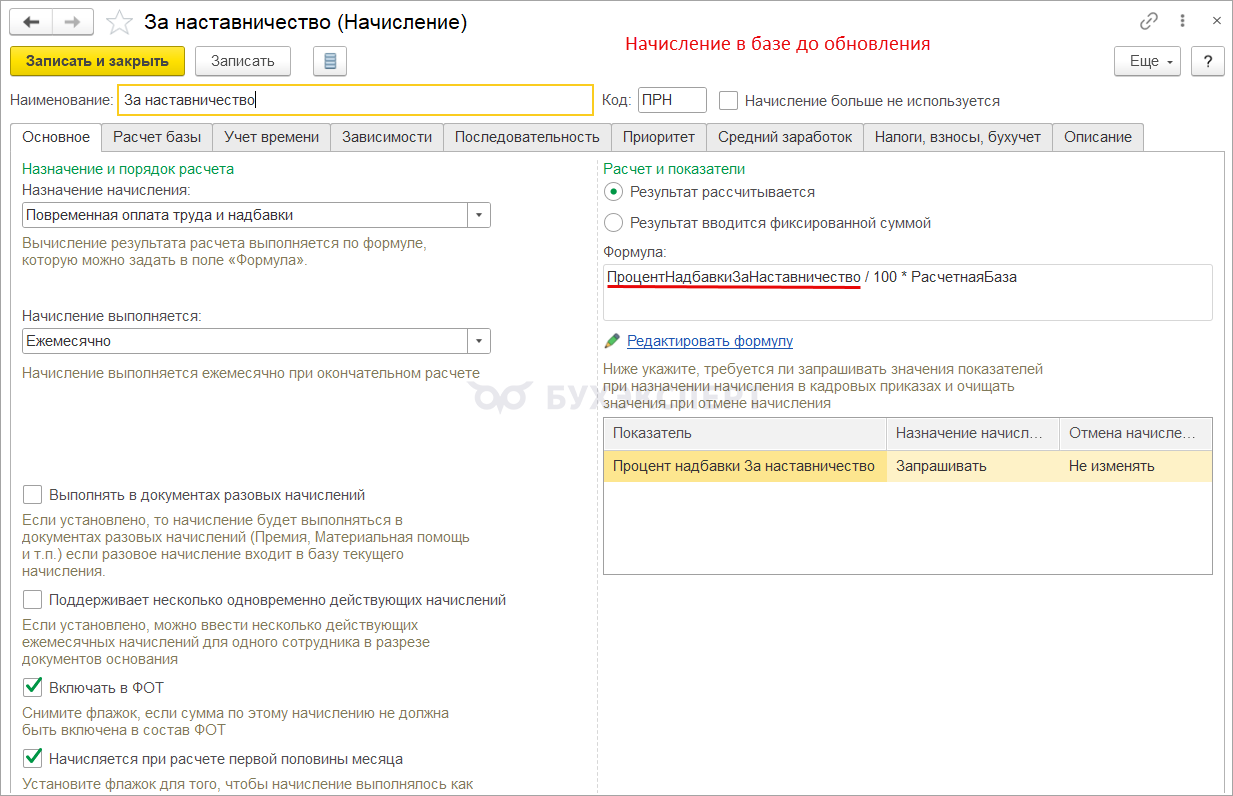 Проблема возникает, если для расчета доплаты в базе до обновления имеется начисление с показателем ПроцентНадбавкиЗаНаставничество (Настройка – Показатели расчета зарплаты).