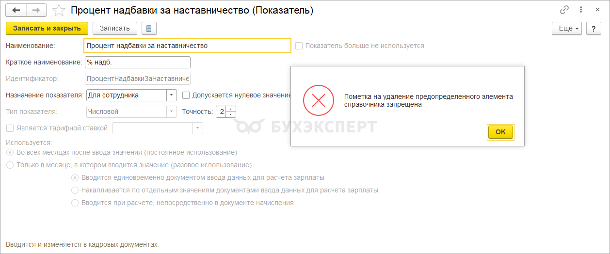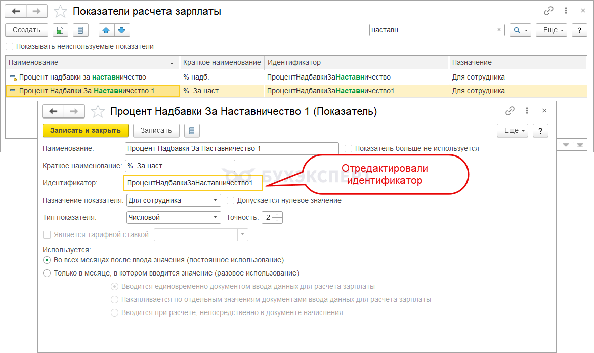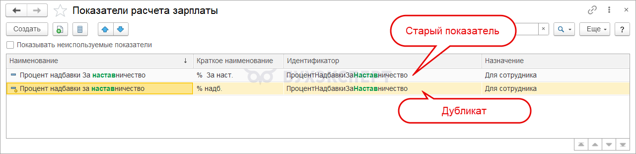 При автоматическом создании нового начисления показатель ПроцентНадбавкиЗаНаставничество задублируется. Потому что вместе с новым начислением программа создаст второй такой показатель. Он будет иметь признак предопределенного.