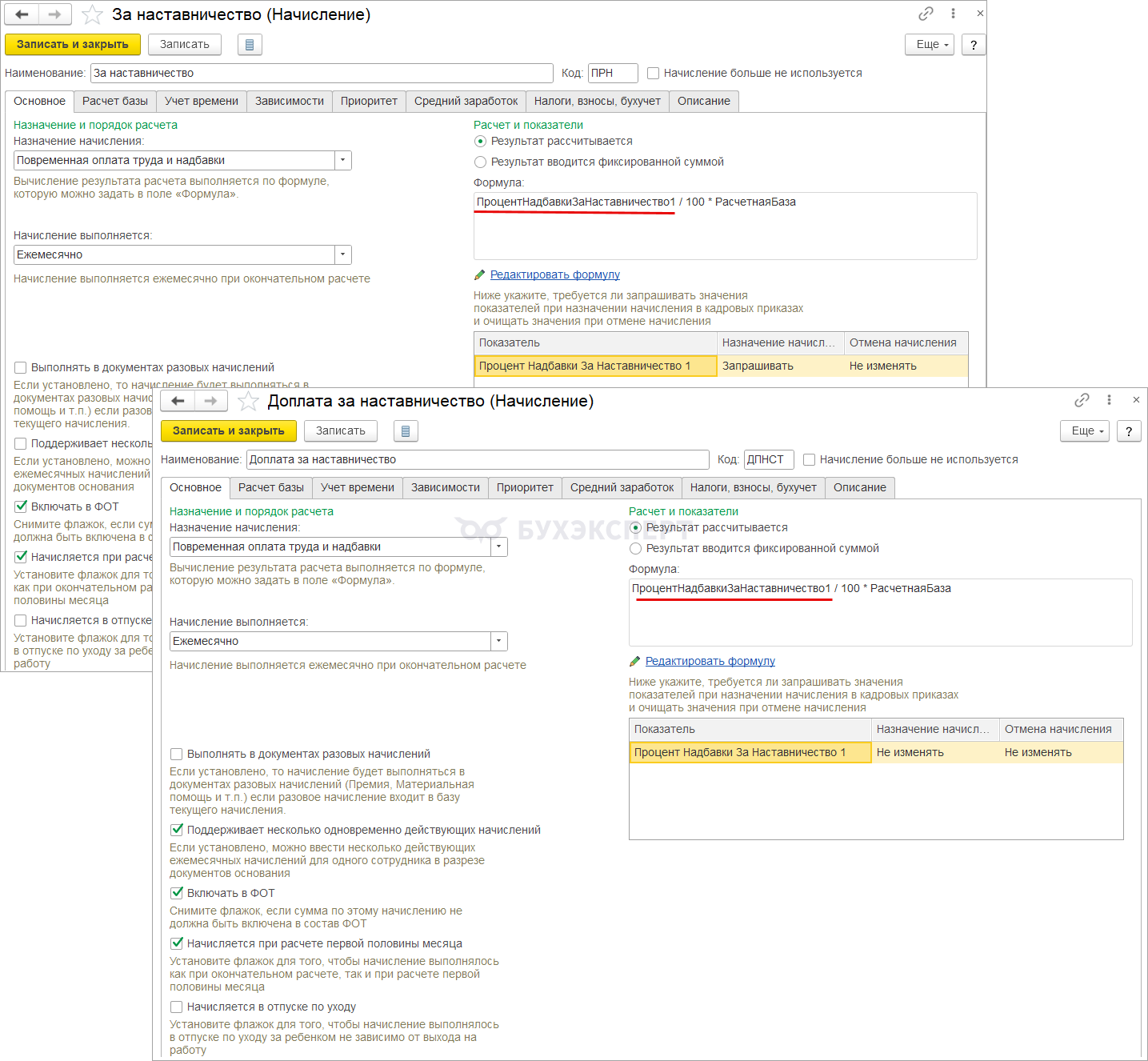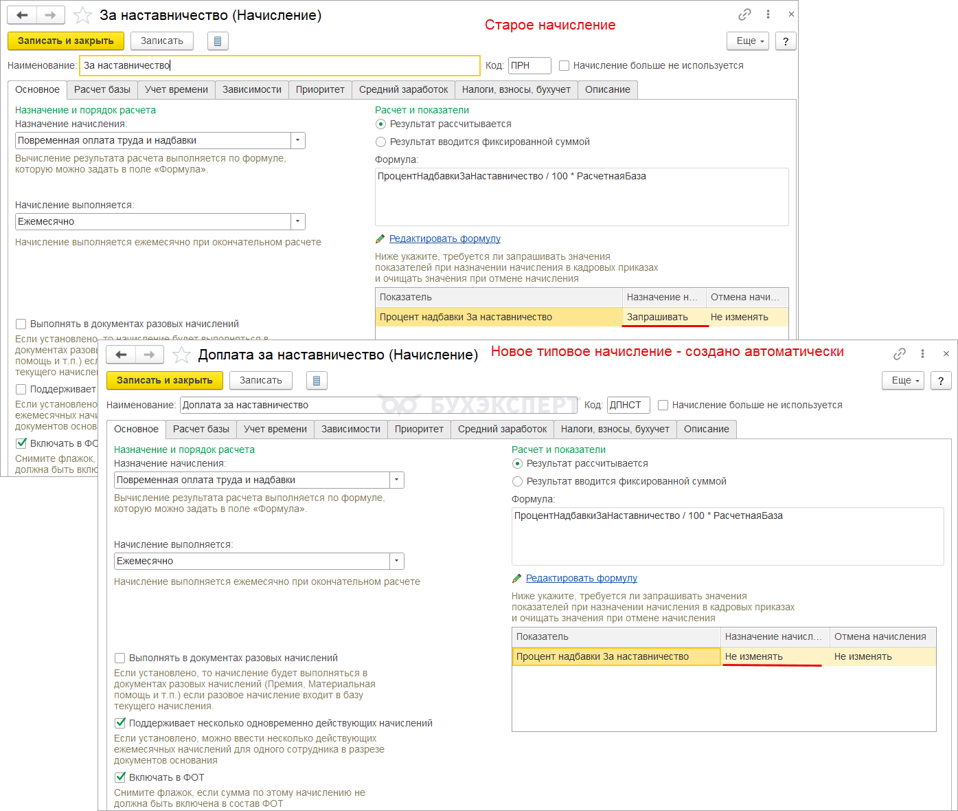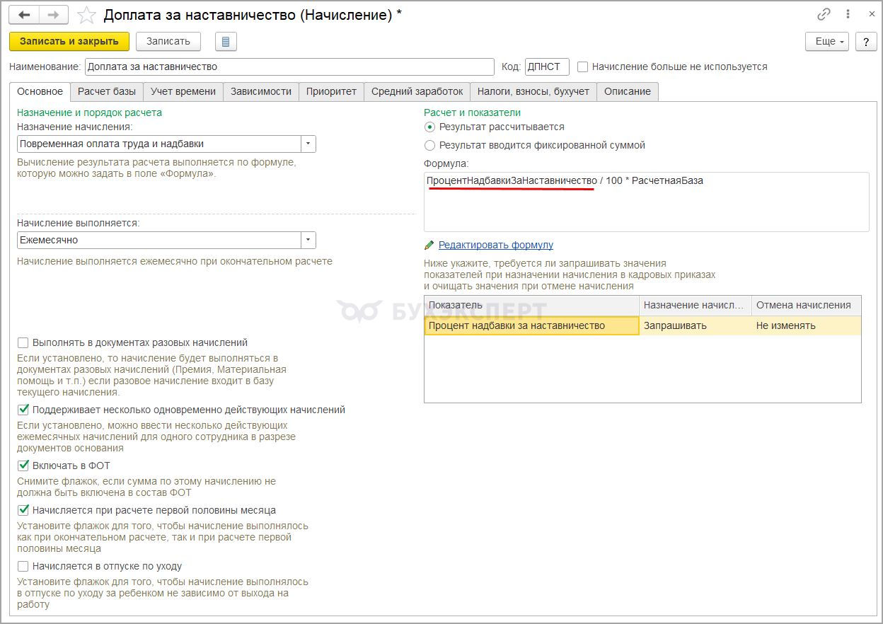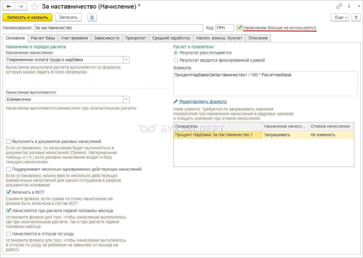 Теперь можно использовать оба вида начисления в учете. Или, если два вида начисления в базе не нужны – можем отменить старую доплату наставникам и пометить старое начисление как неиспользуемое.